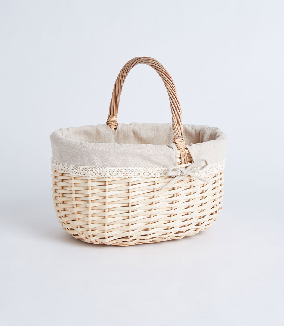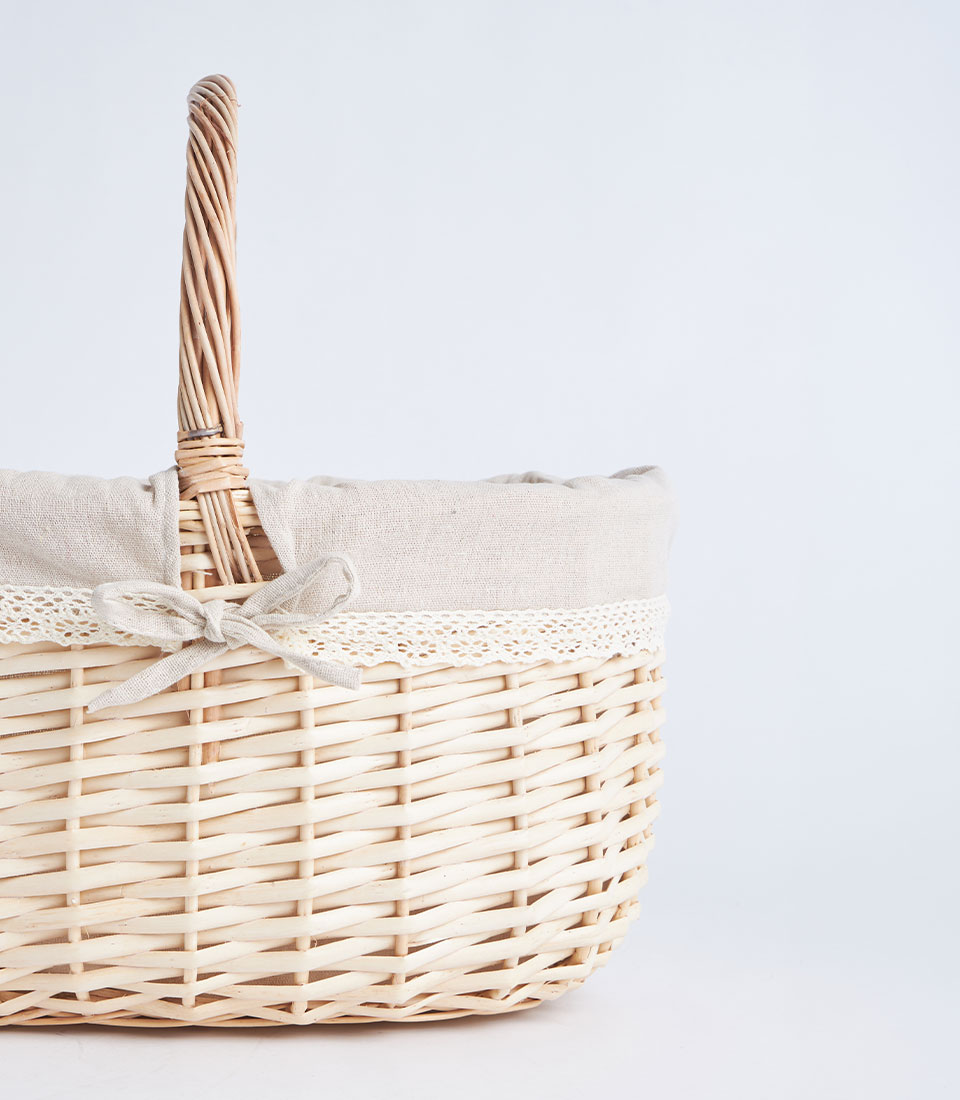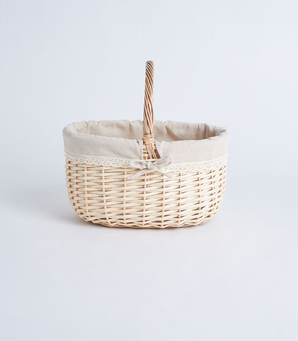A handwoven wicker basket with handle designed for elegant fruit and flower arrangements, perfect for curated gift hampers and decorative gifting presentations.