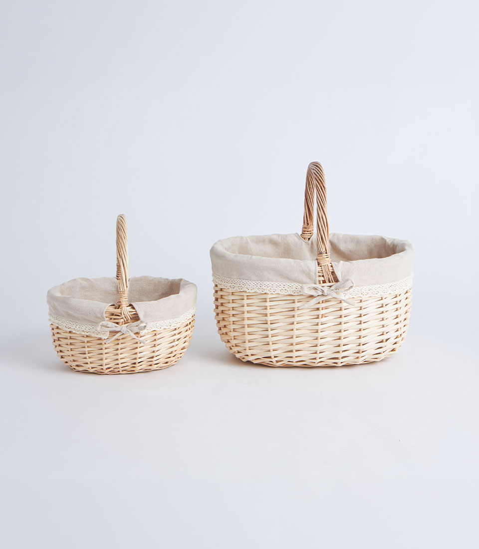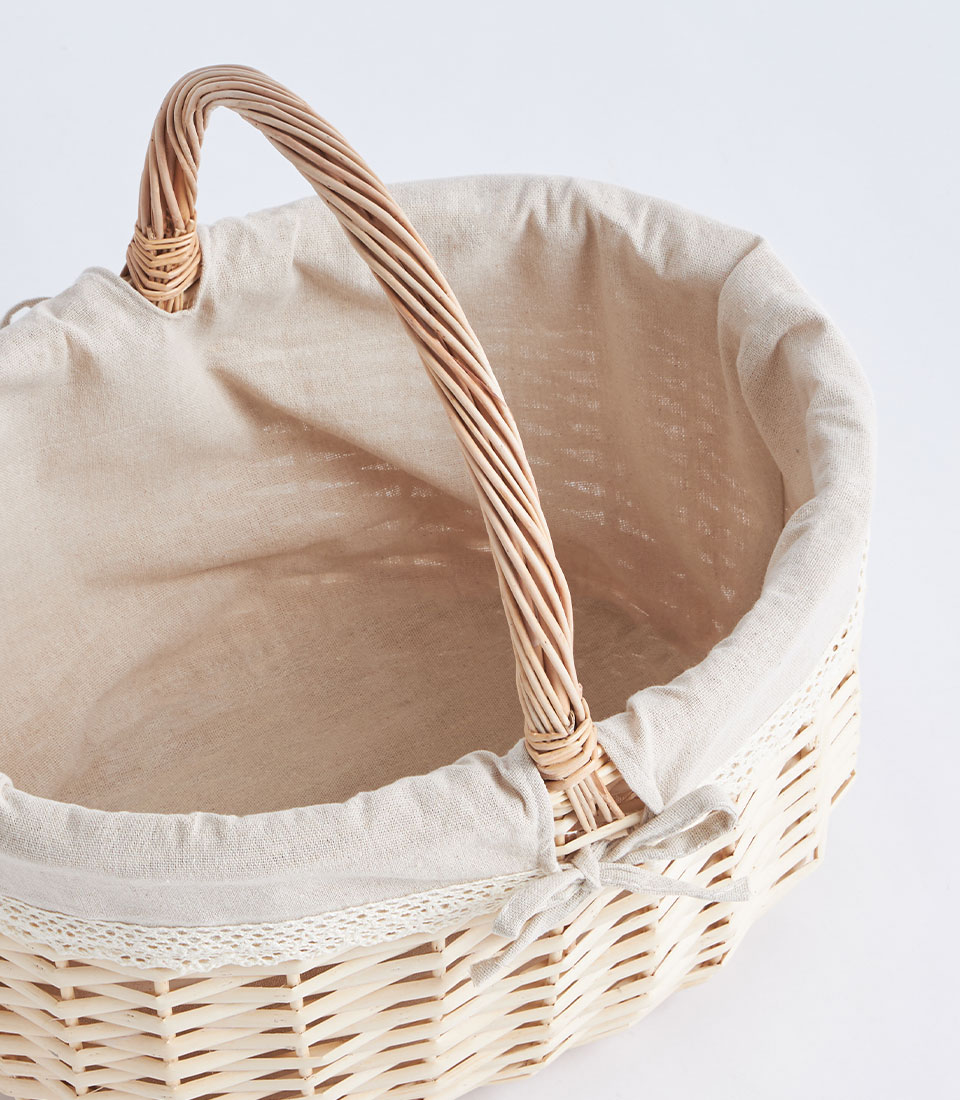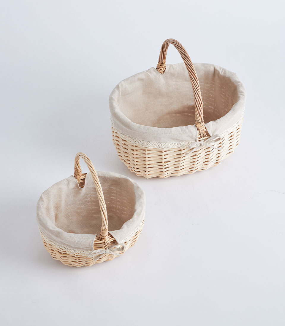 A handwoven wicker basket with handle designed for elegant fruit and flower arrangements, perfect for curated gift hampers and decorative gifting presentations.