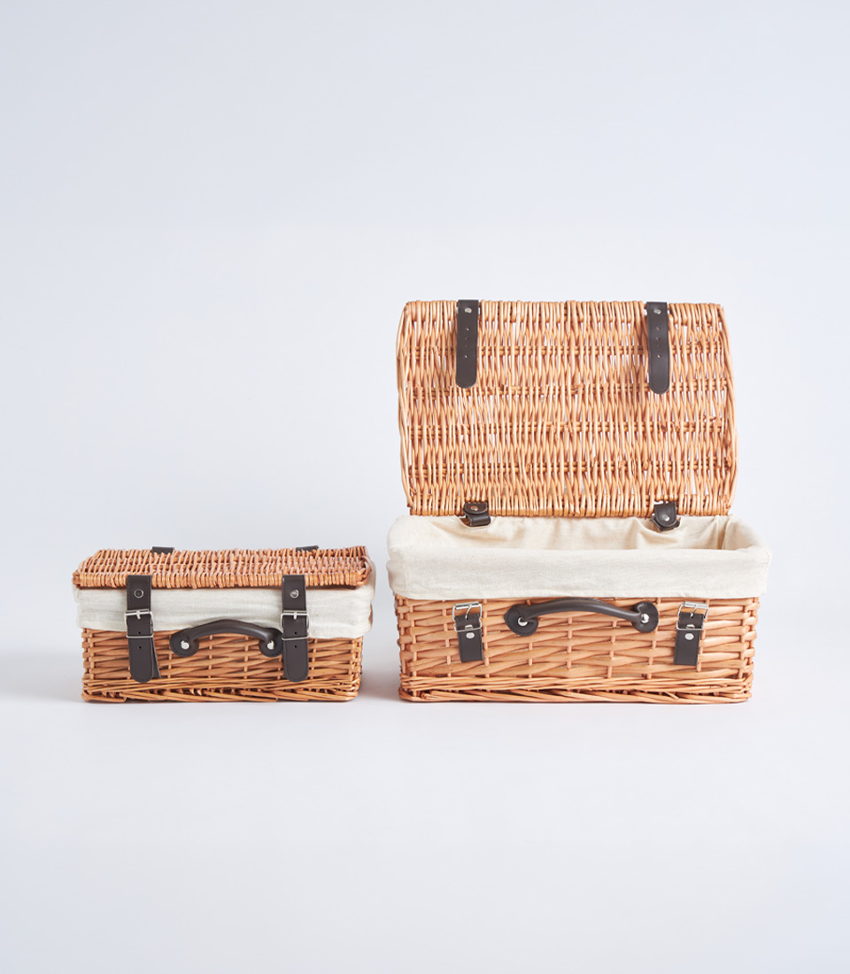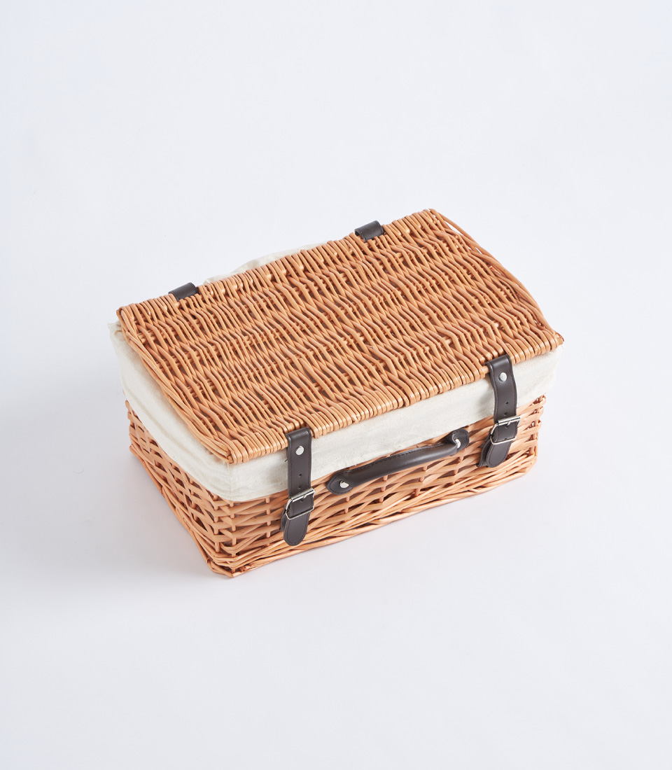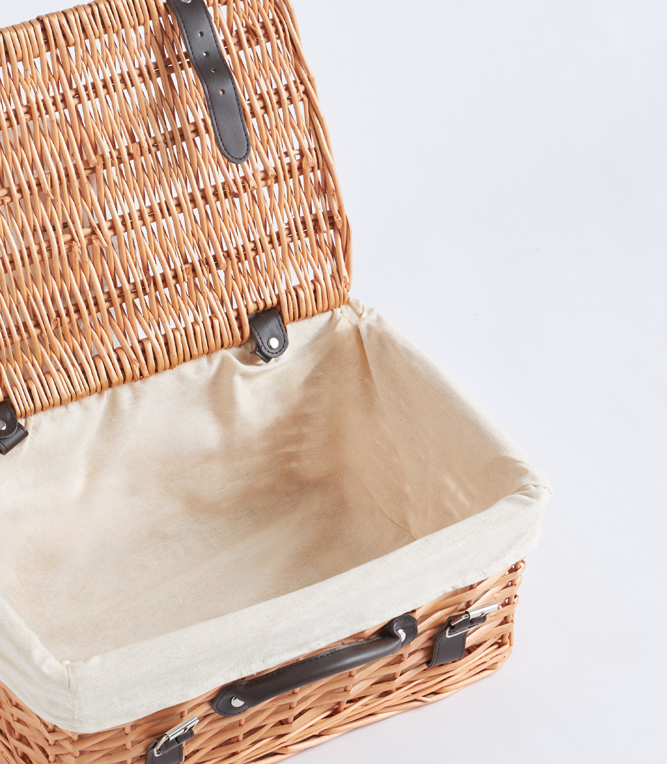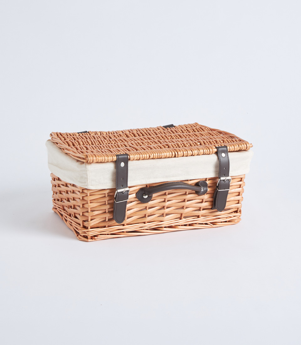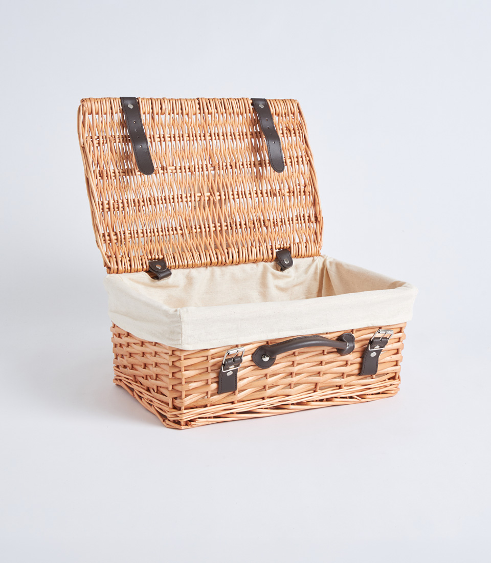 A handwoven wicker picnic-style basket featuring a structured lid and black leather straps. Designed as a timeless and premium base for luxury hampers, festive collections, and elegant corporate gifting.