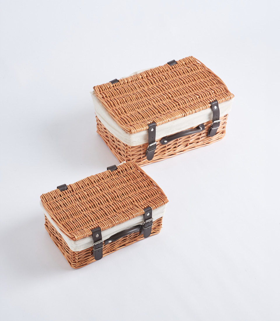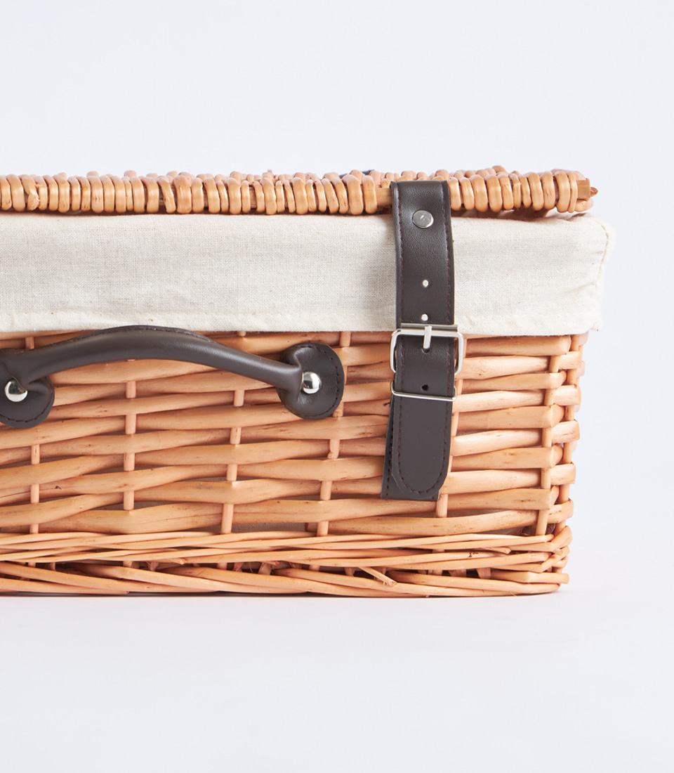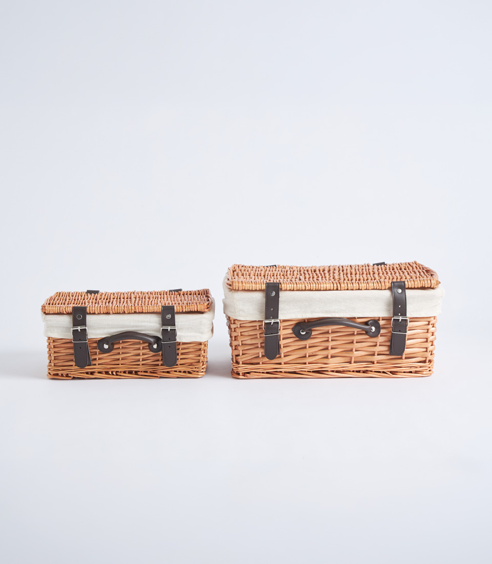 This wicker picnic basket showcases a classic woven construction enhanced by a structured lid and refined leather strap detailing. The balanced rectangular silhouette offers both durability and elegant presentation.