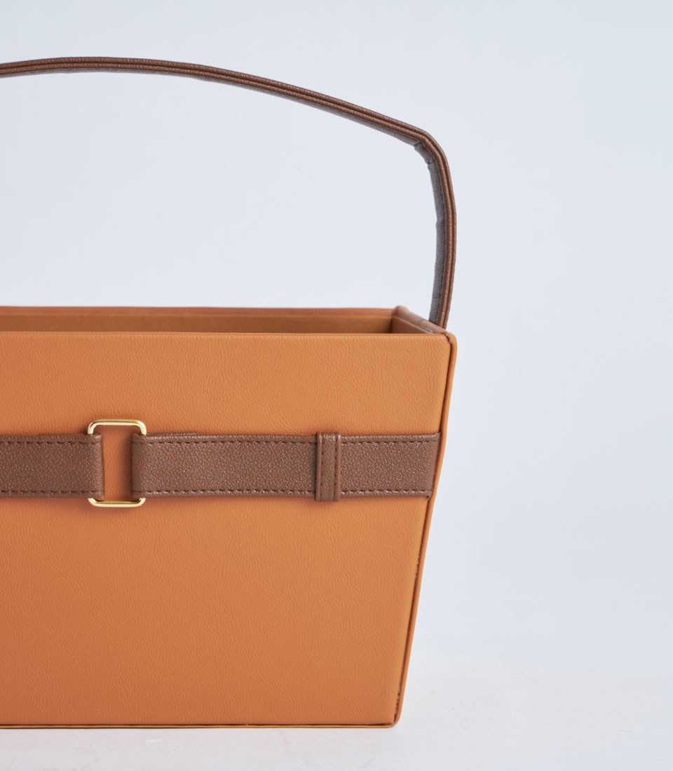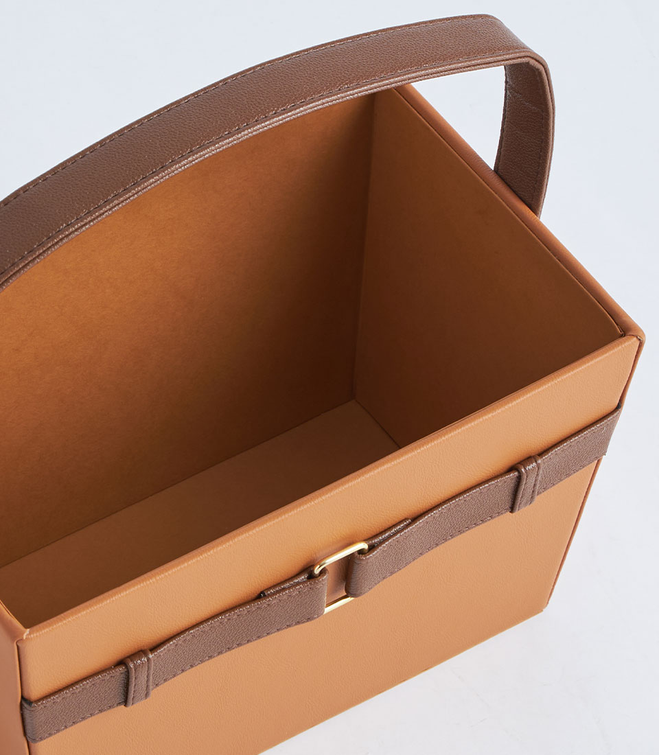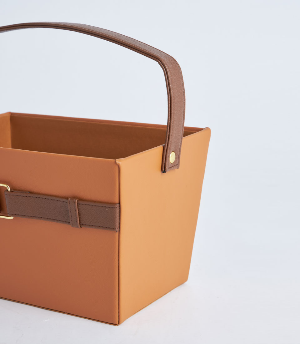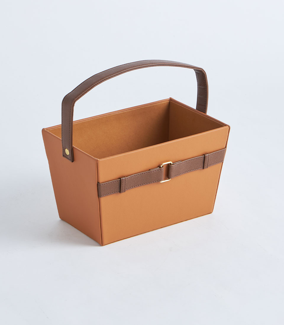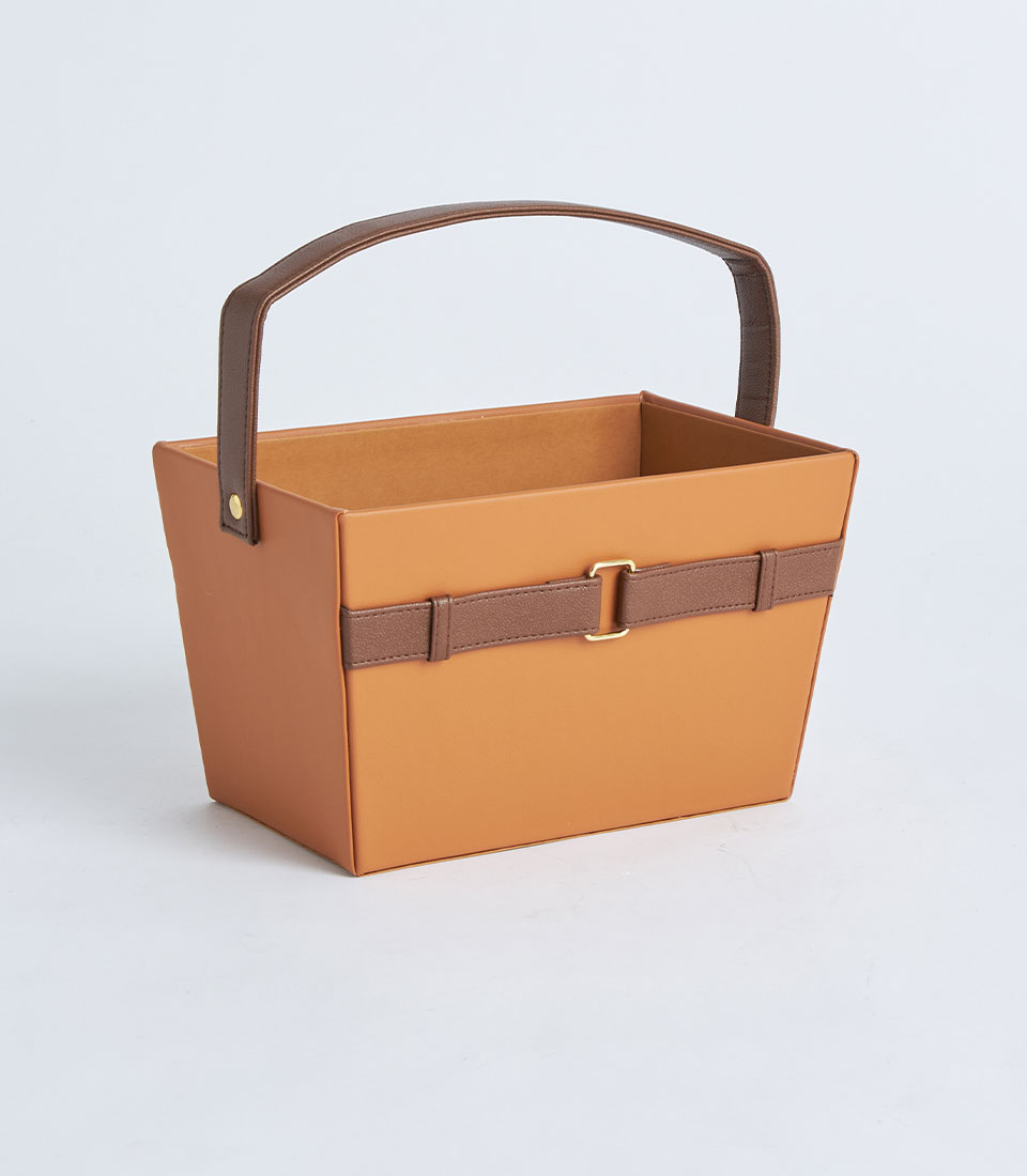 A structured leather gift basket with a strap handle and belt detail, designed for elegant gift hampers, gourmet assortments, and premium gifting presentations.
