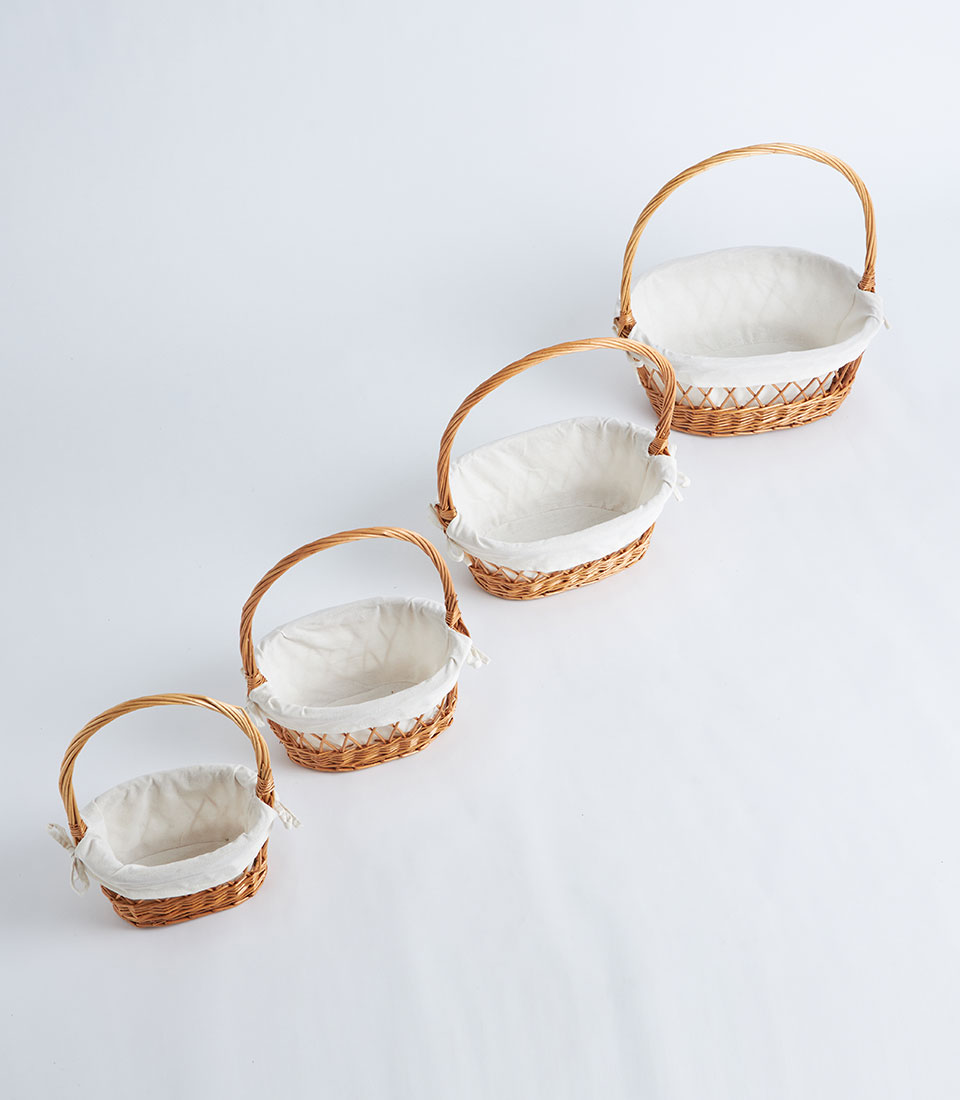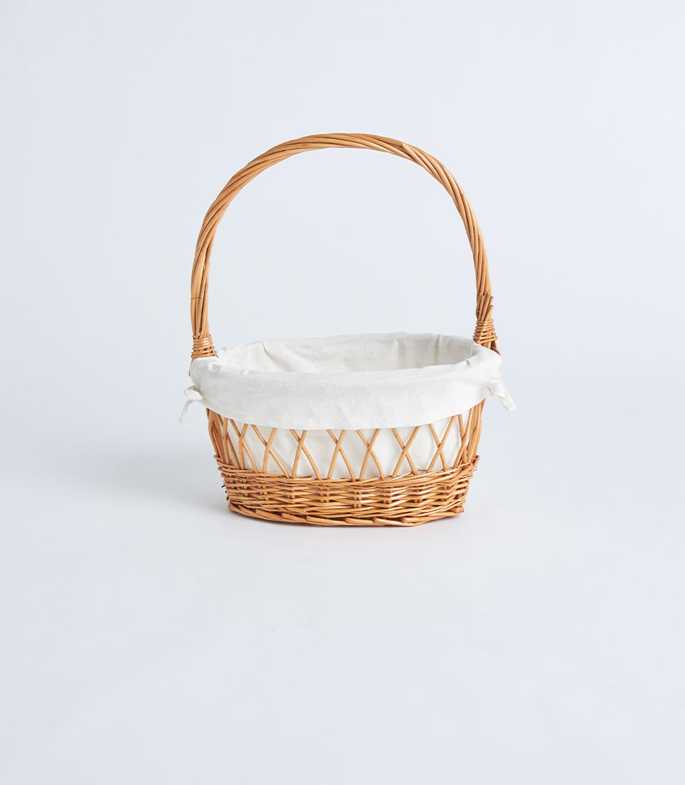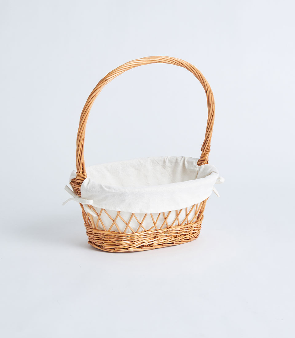 A natural wicker oval basket with lattice weave detail, white fabric lining, and a handle, designed for fruit baskets, bakery gift sets, and elegant gift presentations.
