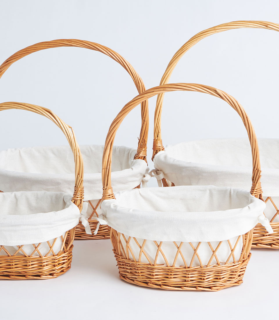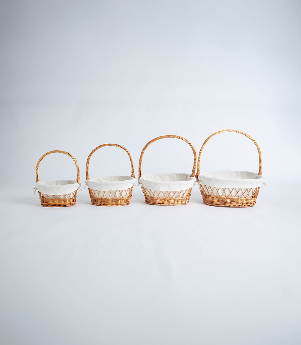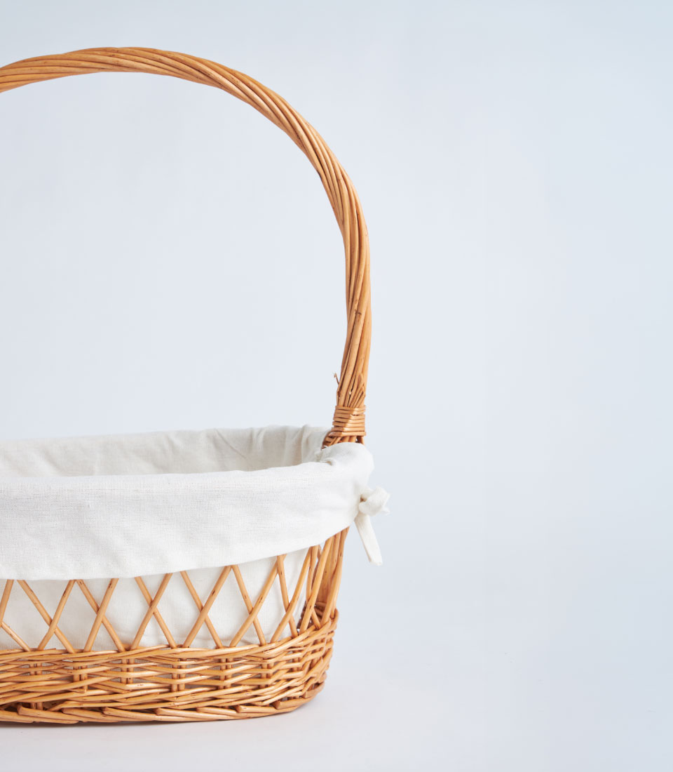 A natural wicker oval basket with lattice weave detail, white fabric lining, and a handle, designed for fruit baskets, bakery gift sets, and elegant gift presentations.