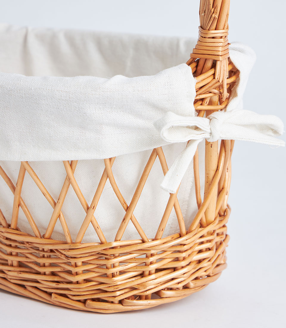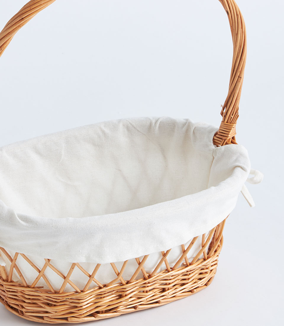 The basket includes a tall curved handle that arches gracefully over the top, allowing convenient carrying while maintaining a classic basket silhouette. A white fabric lining folds neatly over the rim, adding a soft and refined finish to the basket.