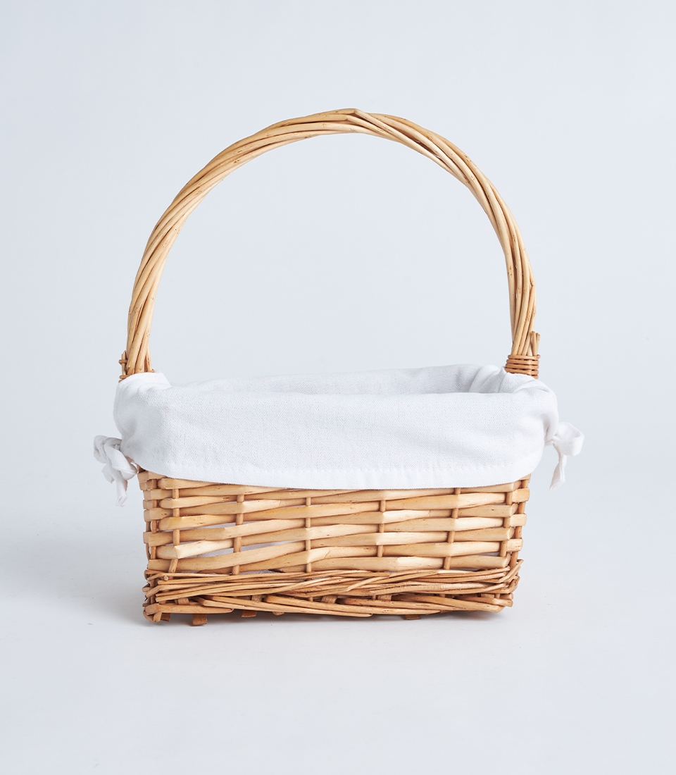A natural wicker rectangular basket with a handle and fabric lining, designed for fruit baskets, bakery gift sets, and elegant gift presentations.