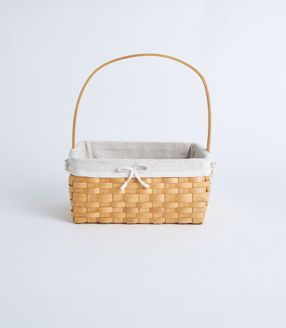 A natural wooden weave basket with handle and fabric liner designed for fruit baskets, bakery hampers, and elegant gift presentations.