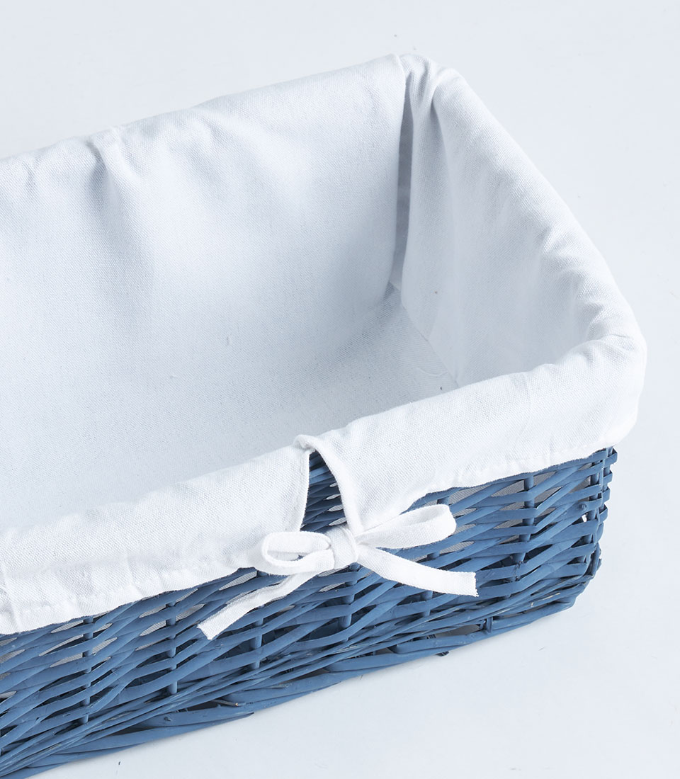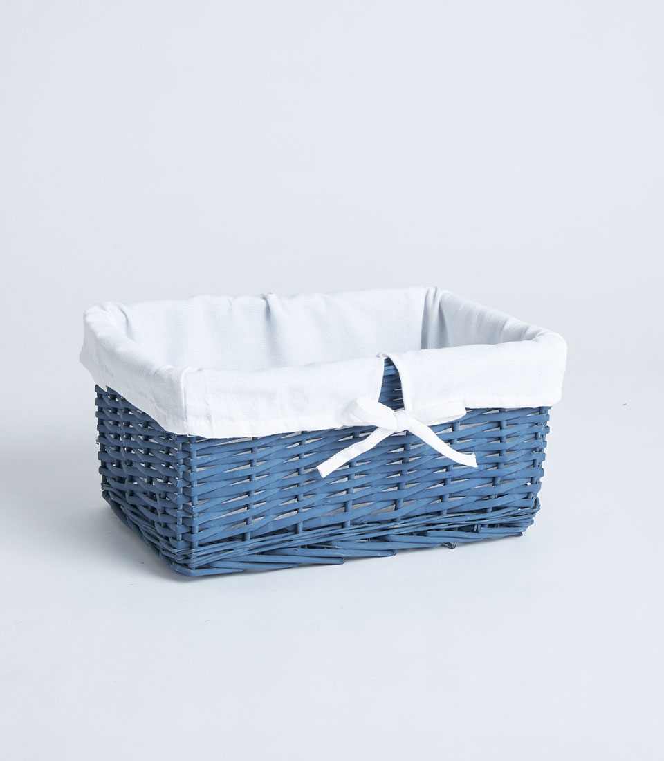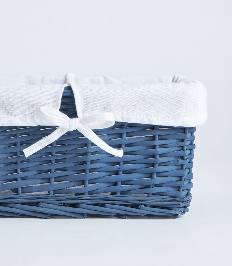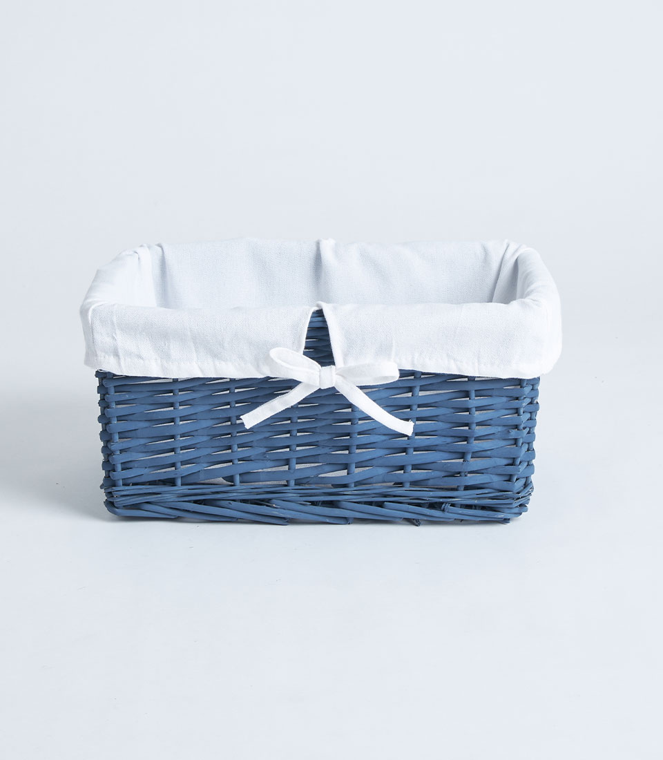 A navy wicker rectangular basket with soft fabric lining and ribbon detail, designed for fruit baskets, bakery gift sets, and elegant gift presentations.
