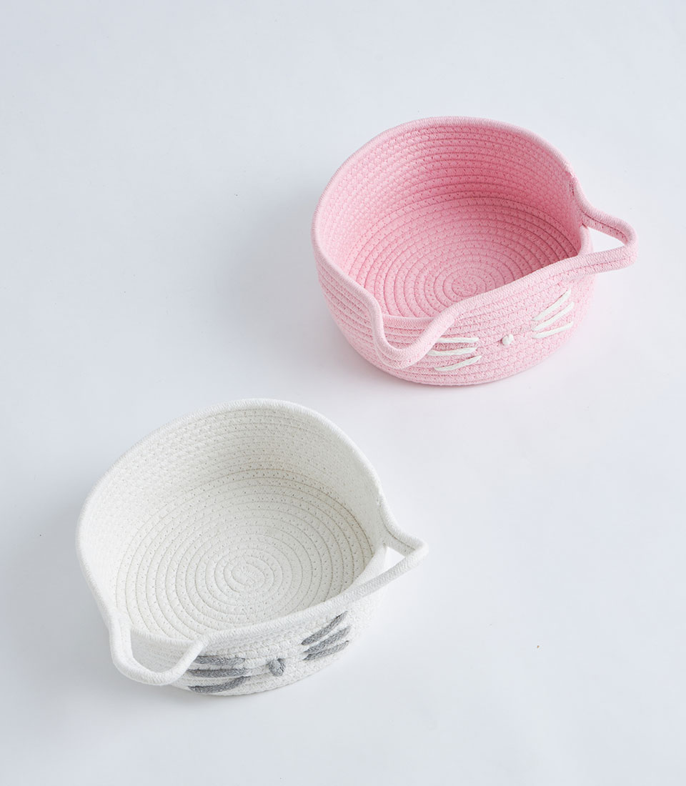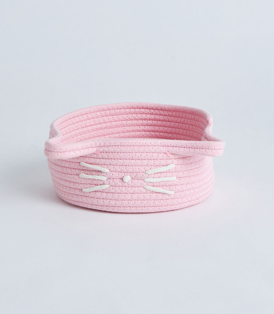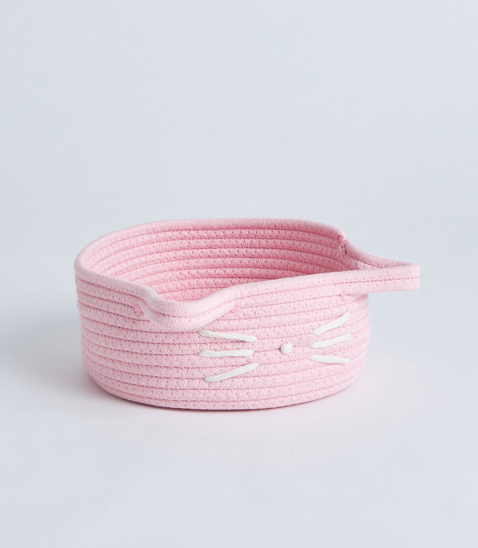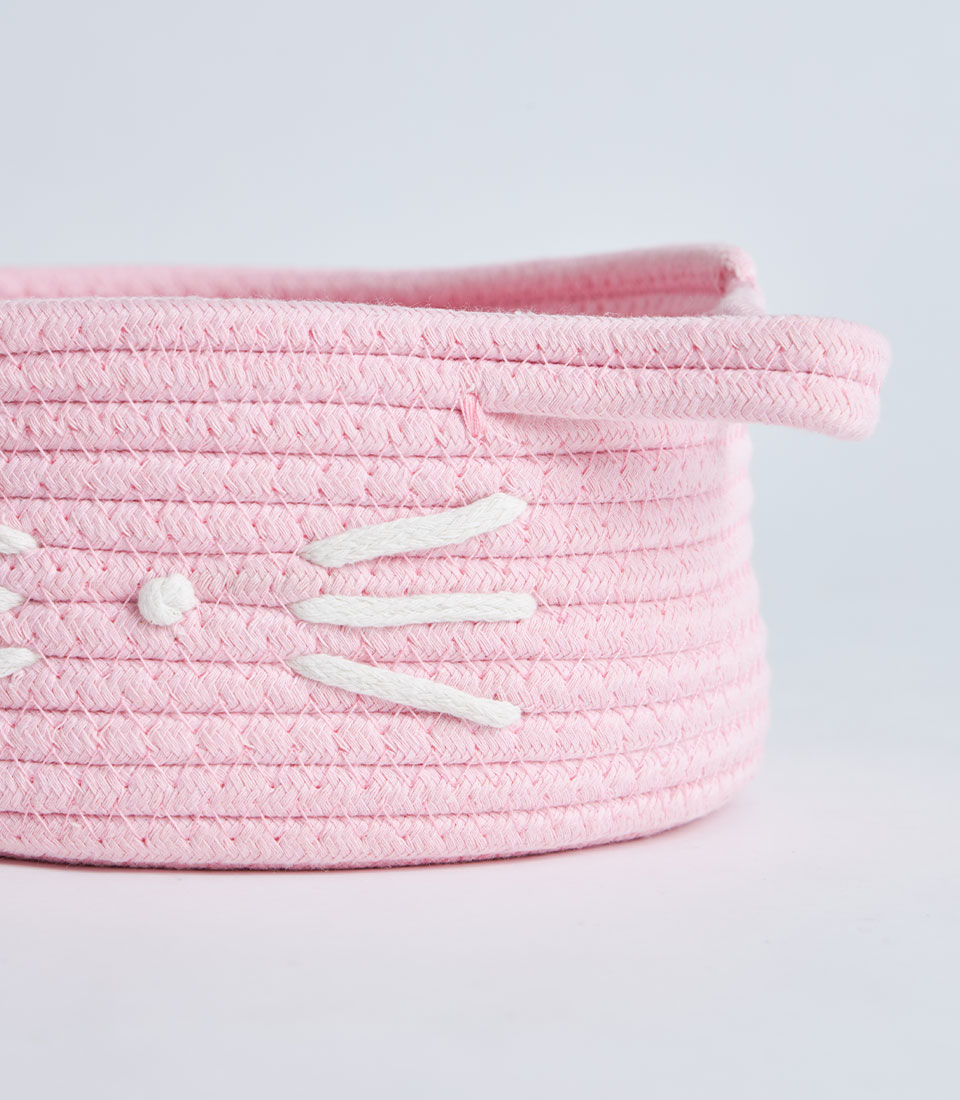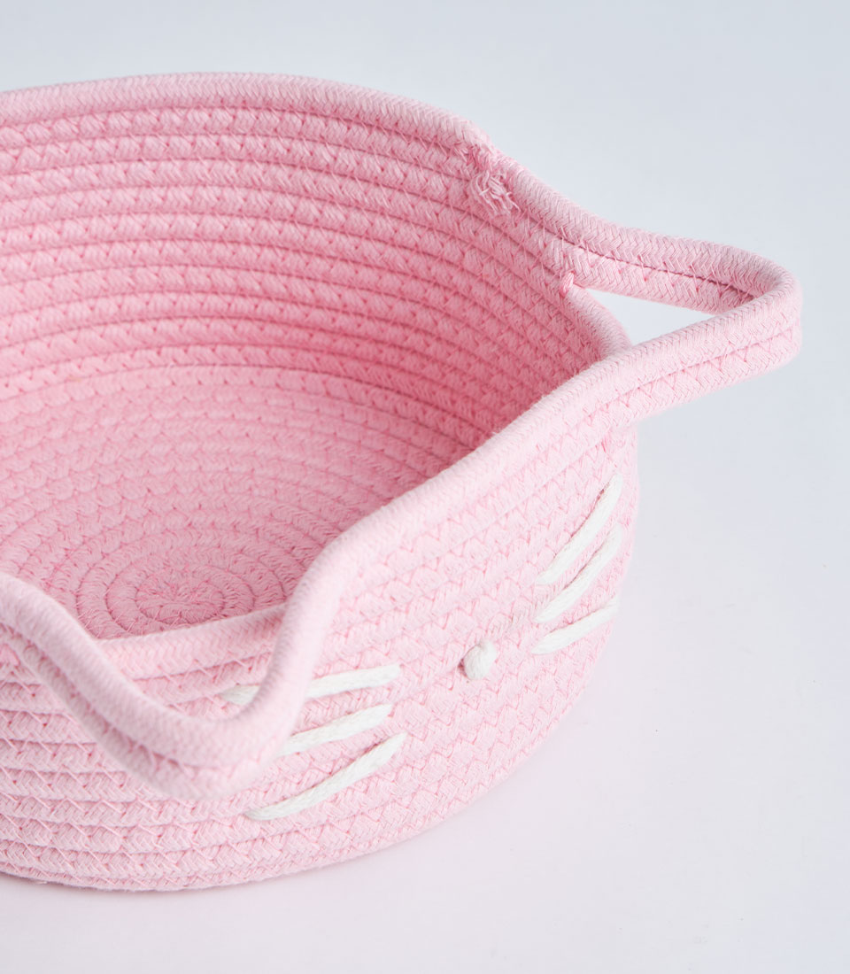 A soft pink cotton rope storage basket with side handles and a cute cat face design, perfect for gift sets, bakery hampers, baby gifts, and decorative storage presentations.