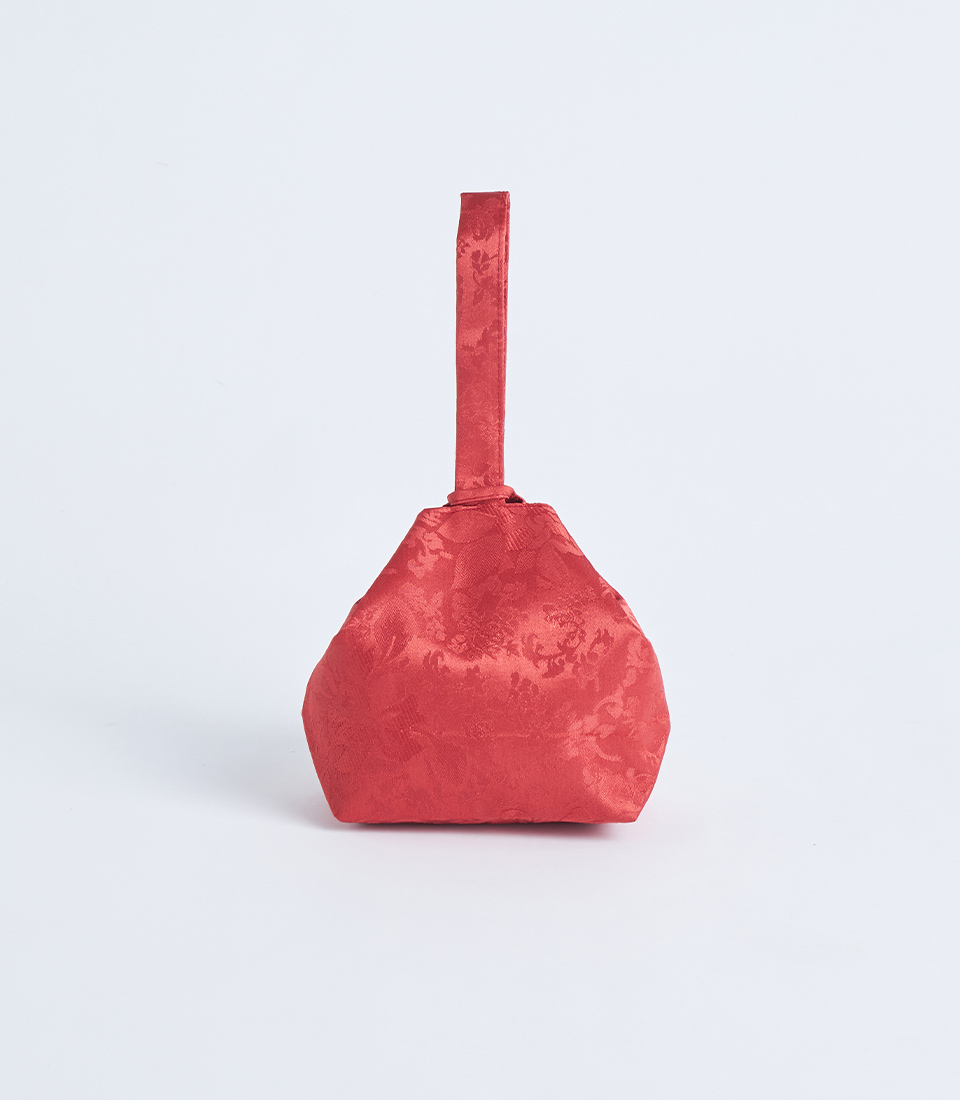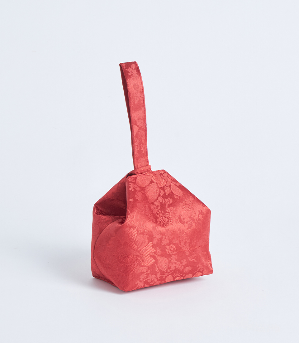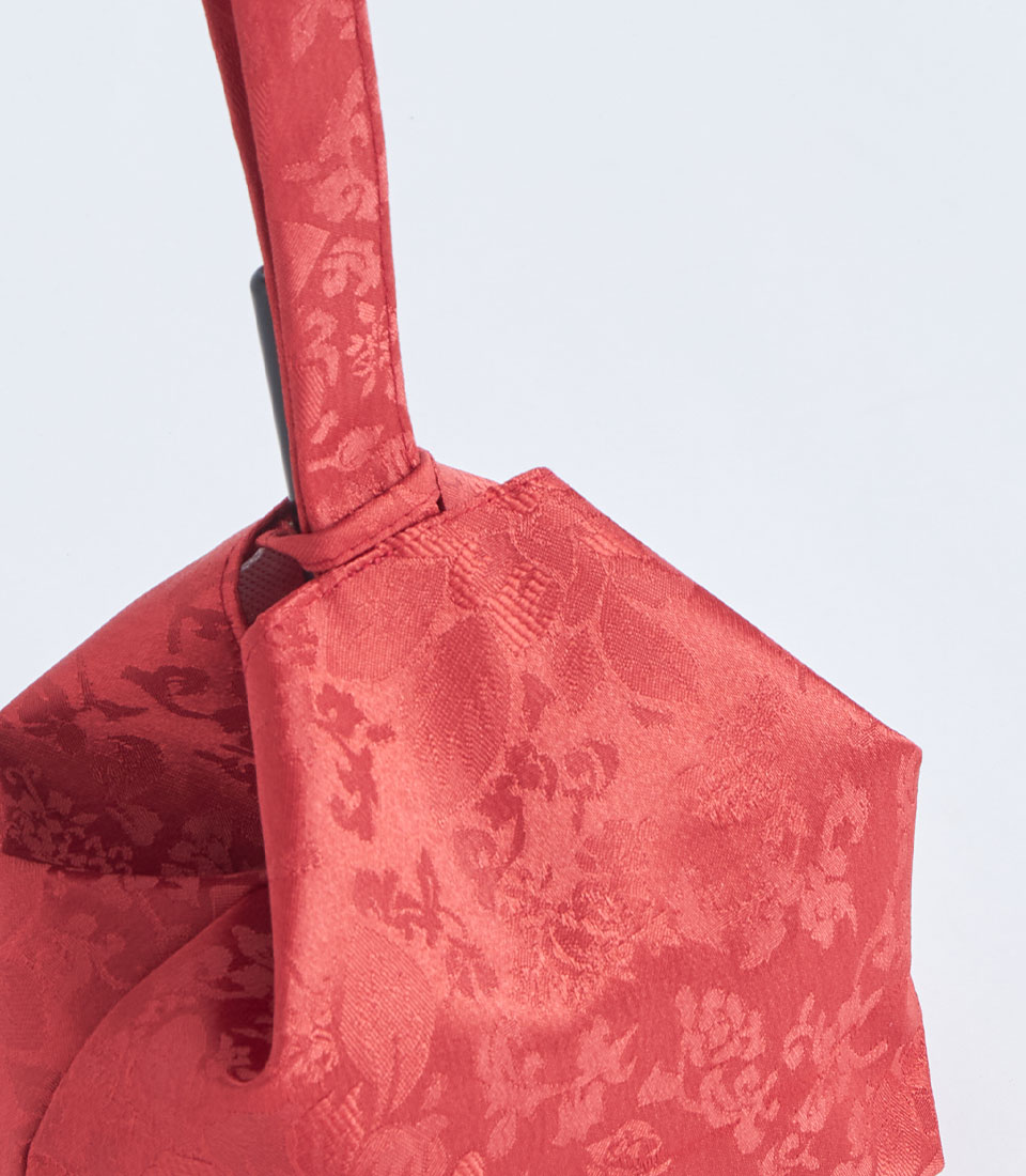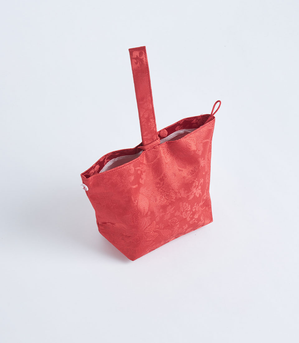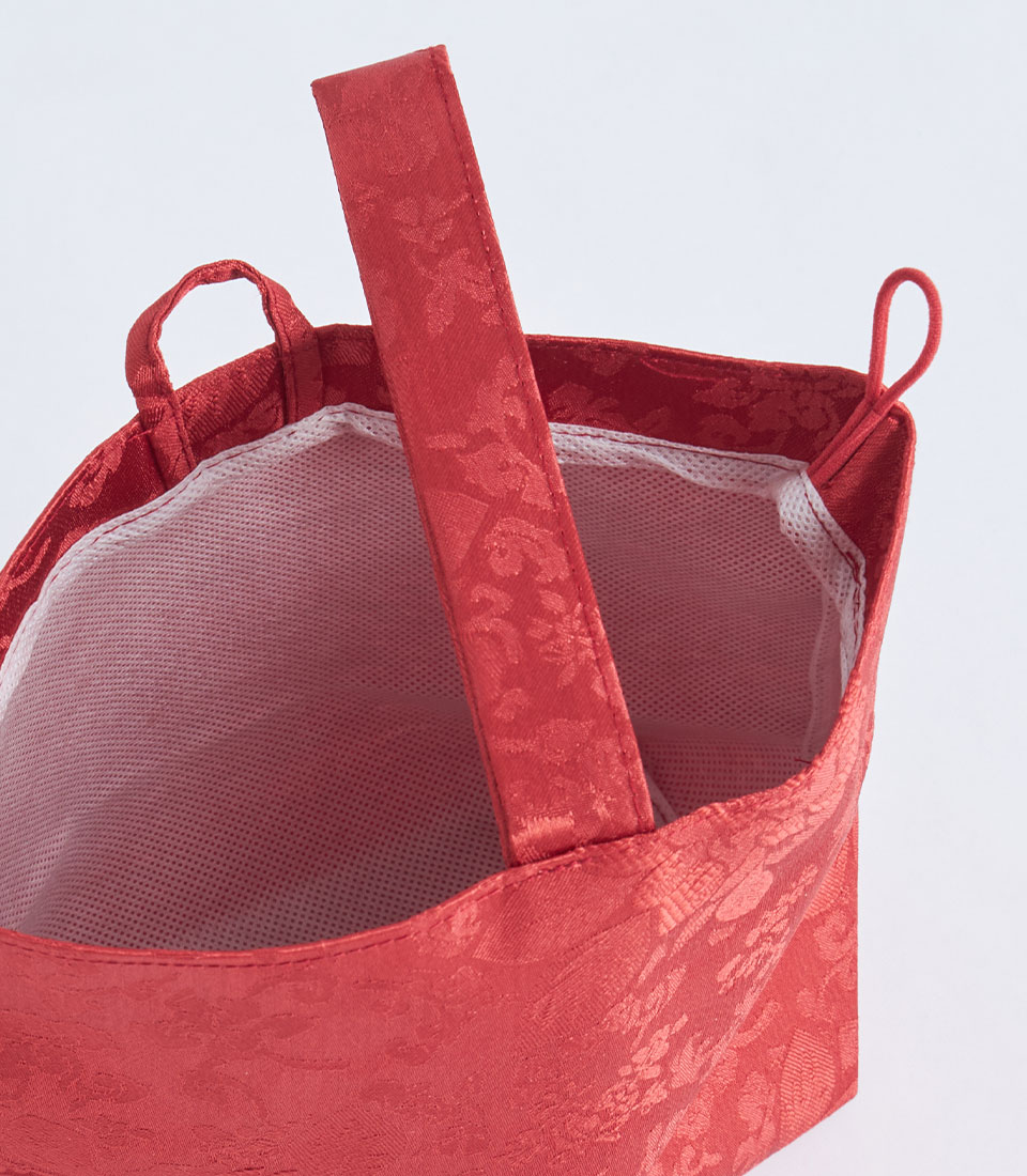 A red brocade fabric gift basket with a handle and decorative flower detail, designed for festive gift sets and elegant gift presentations.