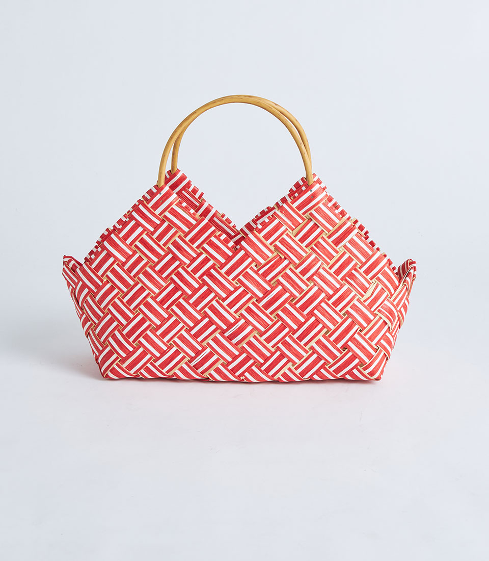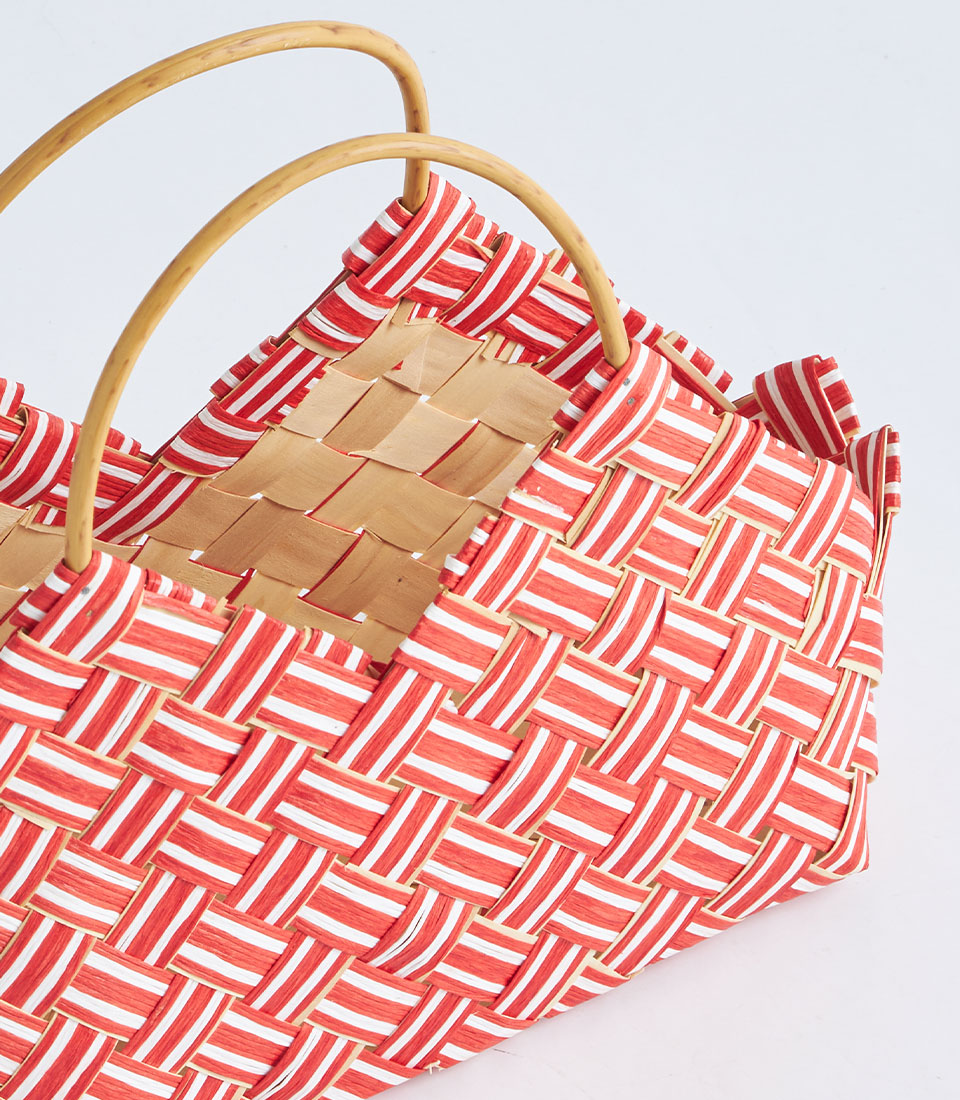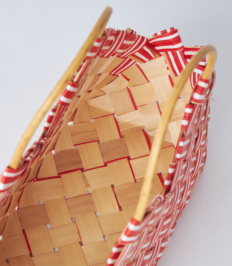 The basket is designed with sturdy handles for easy carrying while maintaining a clean and elegant appearance. The bold red tone and patterned texture make it especially suitable for seasonal hampers and curated gift collections.