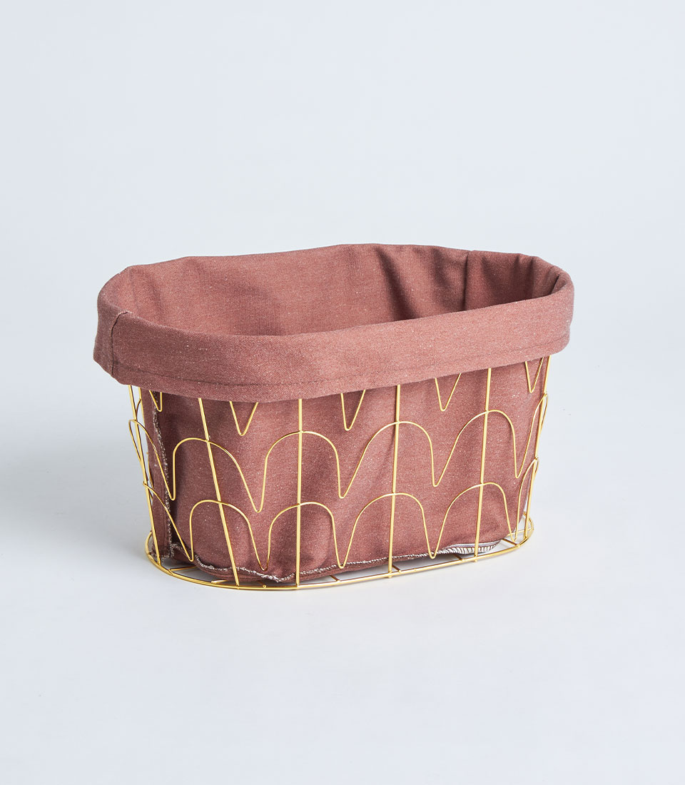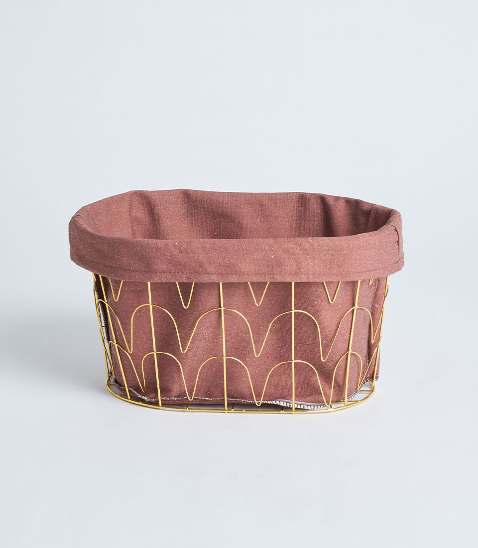 A round basket featuring a gold metal frame structure with tall handles and soft fabric lining. Designed as a modern and elegant base for premium hampers, festive gifting, and refined corporate presentations.