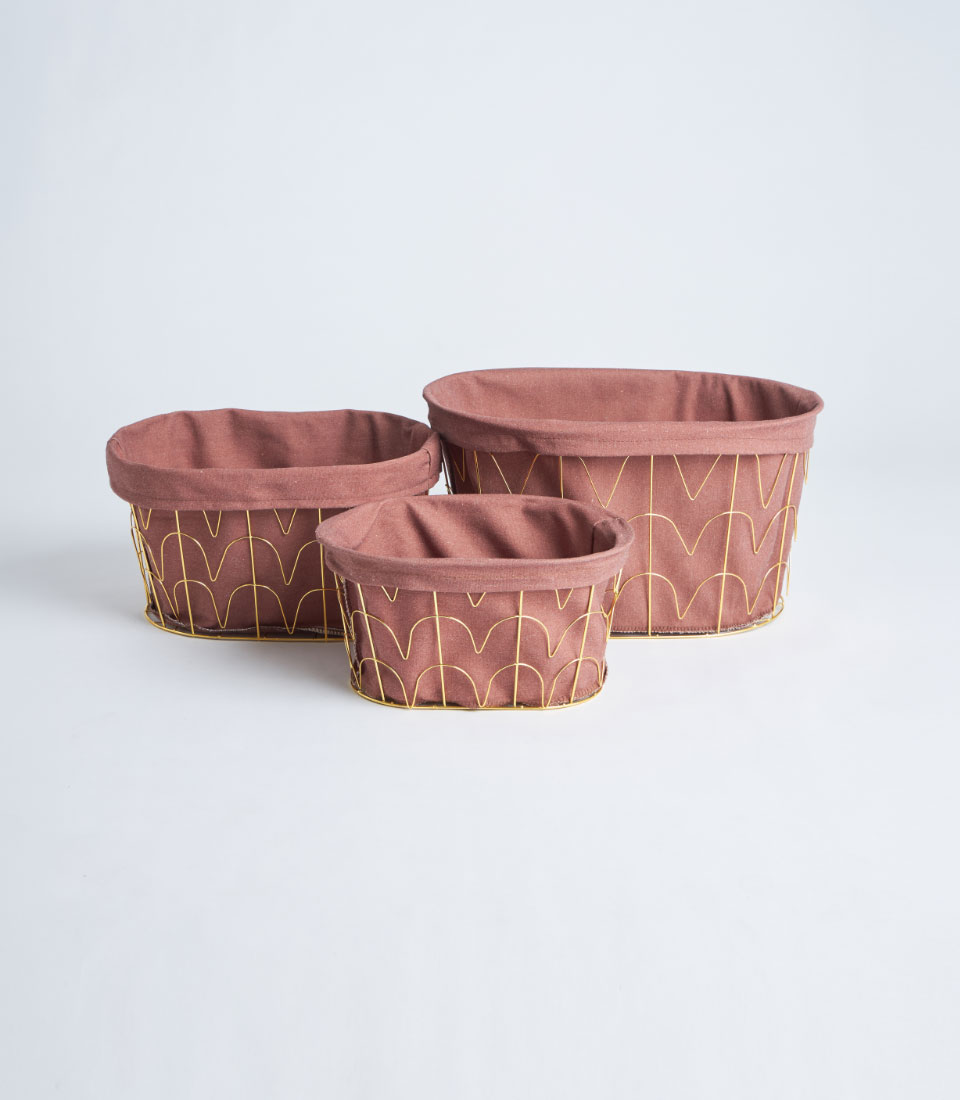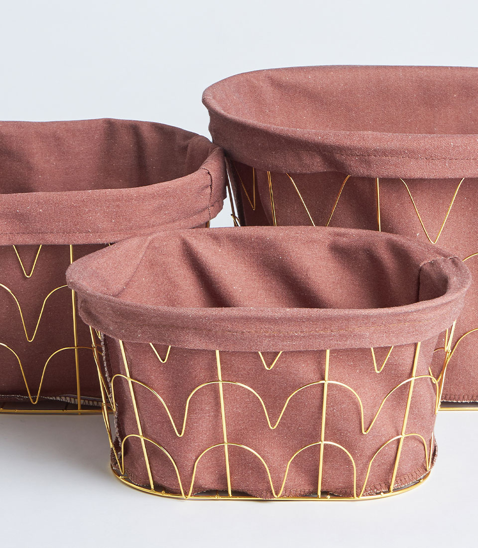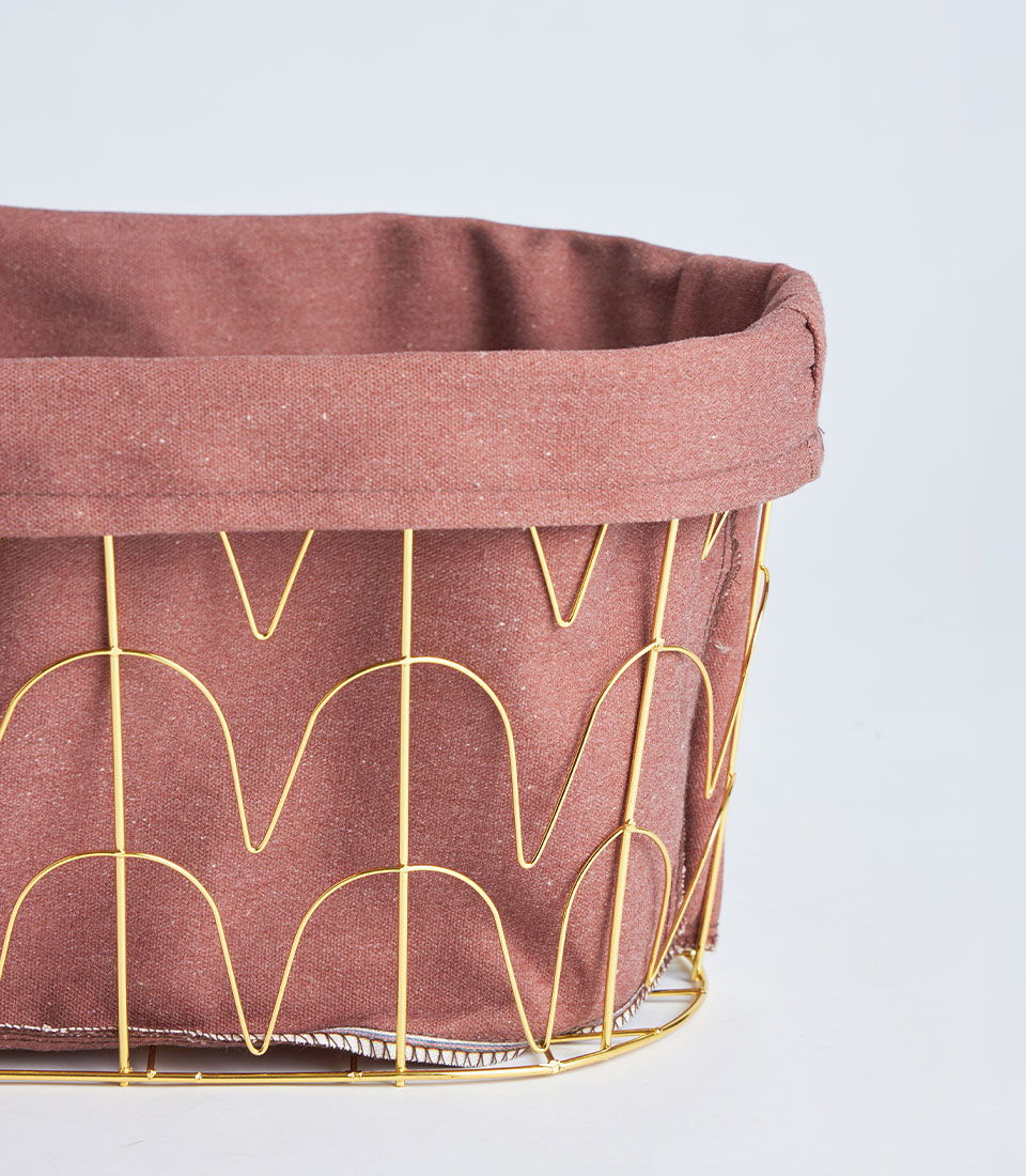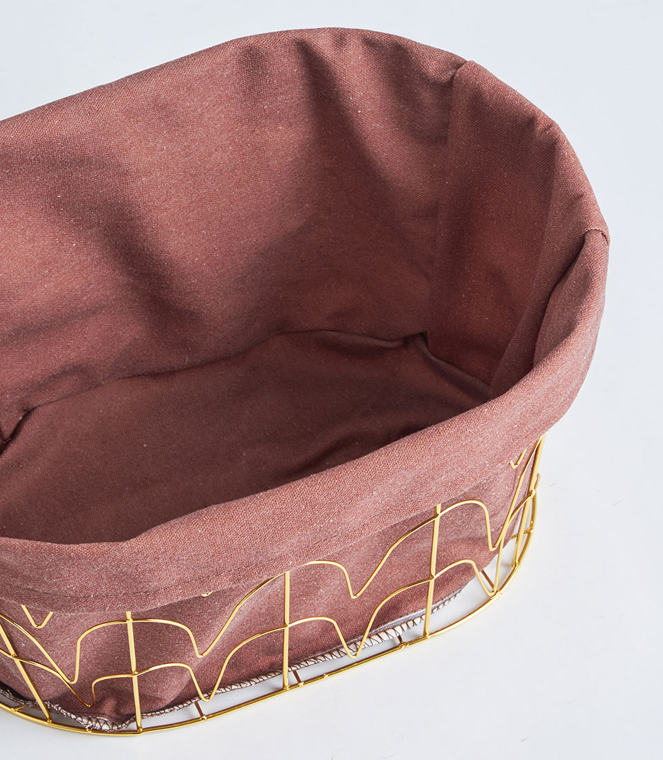 This round basket showcases a structured gold metal frame complemented by tall arched handles and a soft fabric lining. The contemporary silhouette offers a refined and elevated presentation ideal for curated gifting.