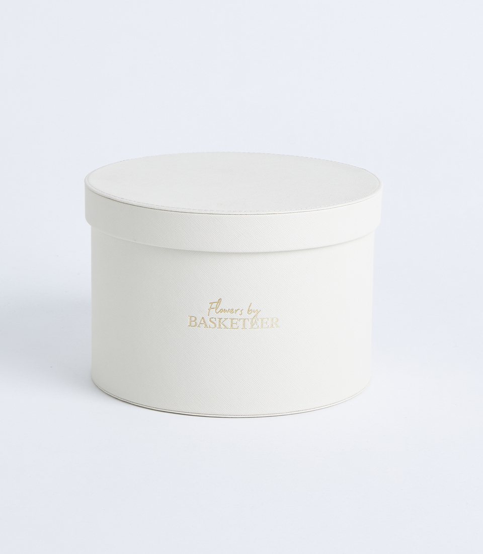 A round ivory hat box with lid and textured finish, designed for elegant flower arrangements and premium gift presentations.