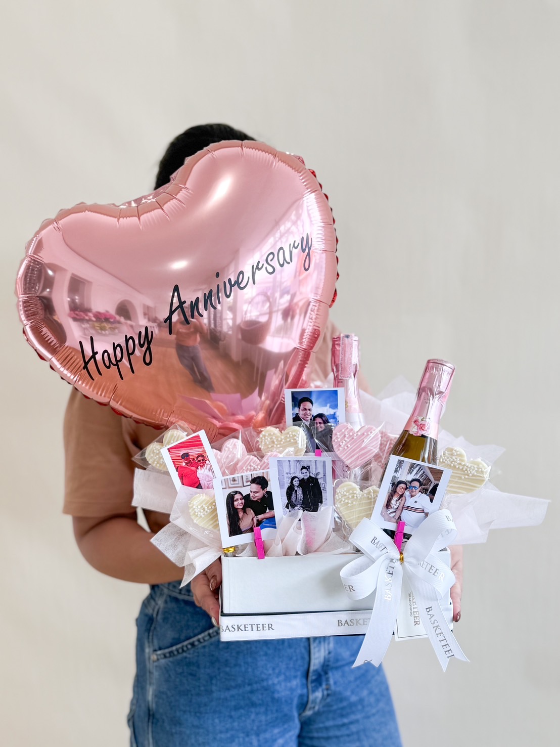 Romantic gift box with “I Love You 3000” balloon, Rosé wine, heart-shaped cookies, and couple photo cards for a personalised touch.