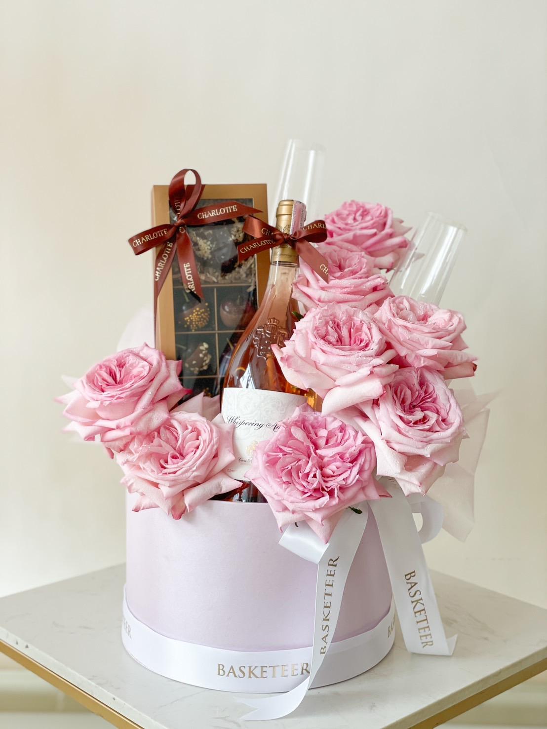 Romantic gift set featuring soft pink roses, sparkling Chandon rosé, and artisanal chocolates in a pastel pink box with elegant details.