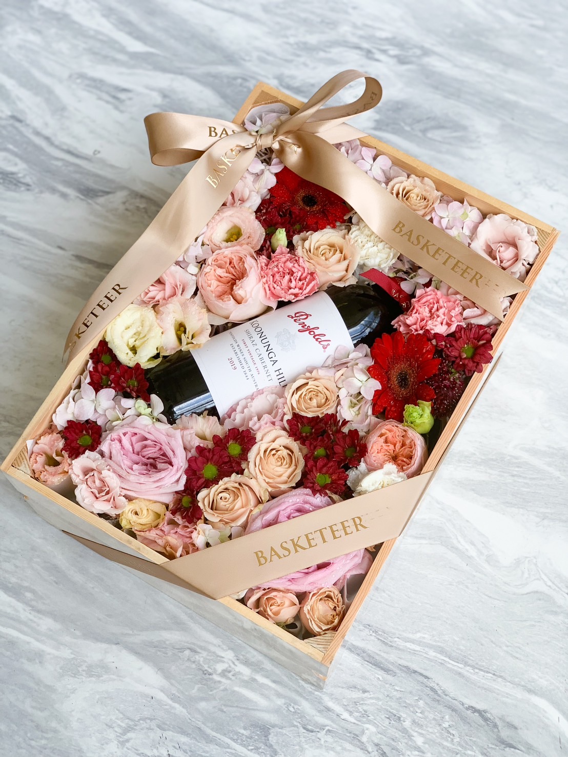 Romantic gift crate with Penfolds Koonunga Hill Shiraz Cabernet surrounded by lush pastel blooms. Ideal for elegant celebrations and heartfelt gifting.